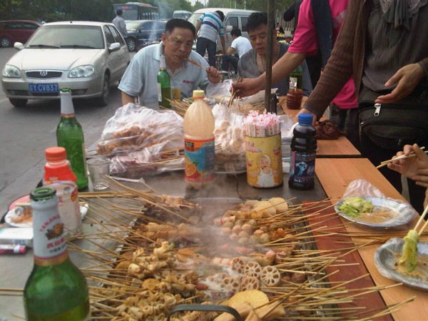人們圍坐著小推車,檔主們開始了買賣,到處一遍紅火的景象。就算是熱辣辣的夏天,對(duì)愛吃的人們來說,根本形成不了障礙,誰叫我就愛這陣香氣,就愛這種嚼勁,就愛喝熱湯逼出來的那種大汗淋漓的感覺。