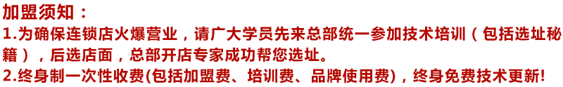 | 1、品牌支持: 品牌名稱、商標標識、包裝條形碼、VI體系,全部免費贈送,強力支持投資人開拓市場。利用環(huán)球餐飲的品牌知名度和號召力,吸引消費,擴大市場占有率。 2、經(jīng)營支持: 環(huán)球餐飲共設六級投資商,不同的投資商,在經(jīng)營重點、市場戰(zhàn)略方面各不相同,環(huán)球餐飲針對不同的投資商,給出了詳盡細致的經(jīng)營方略指導,規(guī)避摸索風險,少走不必要的彎路。 3、配方支持: 所有產(chǎn)品配方,毫無保留,全部傳授給投資商。 4、技術(shù)支持: 產(chǎn)品制作工藝、制作設備、設備維修、保養(yǎng)等全部技術(shù),悉數(shù)傳授。 5、培訓支持: 環(huán)球餐飲專設內(nèi)部招待所,所有投資商培訓期間,免費食宿,培訓內(nèi)容包括:配方,工藝,設備,技術(shù),經(jīng)營方略,廠、店、攤的管理,選址要領(lǐng),裝修方案等等,學會為止,考核通過。 6、后續(xù)服務支持: 新配方、新技術(shù)、新設備的不斷開發(fā)和研制,增加產(chǎn)品賣點,讓工藝更完善,提高效率,降低成本。前期投資者,在今后均可免費獲得最新研發(fā)成果,添置新設備,一律按成本價供應,同時長年提供輔料供應。 7、廣告支持: 針對中國市場,環(huán)球餐飲制定立體化的廣告戰(zhàn)略,品牌廣告包含影視媒體:央視、各地方衛(wèi)視,網(wǎng)絡媒體:新浪、搜狐、QQ、TOM等數(shù)十家全國性門戶網(wǎng)站;平面媒體:商界、知音、讀者、參考消息、體壇周報等全國大型期刊雜志及各地方晚報、早報等。 8、無形資產(chǎn)支持: 全套無形資產(chǎn),包含營銷理念,產(chǎn)品理念,技術(shù)骨干、管理骨干、業(yè)務骨干的培養(yǎng),營銷策劃,廣告創(chuàng)意及投放策略,業(yè)務談判,人力資源,品牌管理,財務管理,VI體系等等,上述一切除了培訓期間面對面?zhèn)魇谥?,還將制作光盤,讓投資人反復研習,直到融會貫通,運用于實戰(zhàn)。 總部承諾:傳授全套“石鍋魚”烹飪技術(shù),加盟后由總部免費提供賓館食宿。 |