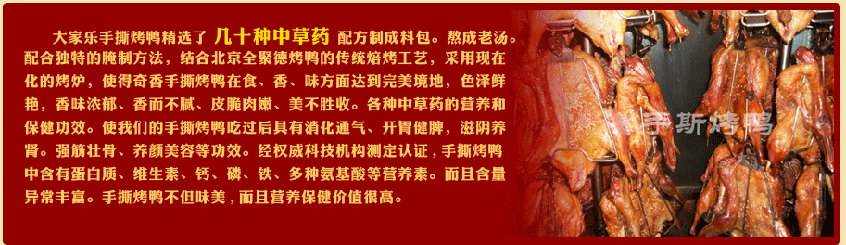 秘制配料:吸取百年中華民族鹵臘烤燒文化精髓及南北口味特點(diǎn),借鑒國外美食精華,實(shí)現(xiàn)鹵烤、燒臘完美組合,結(jié)合現(xiàn)代工藝,精選并融合多種天然中藥材及天然食品香料,秘制成“鴻運(yùn)軒”特制“香港透骨香酥板鴨專用料”。通過該料并經(jīng)“鴻運(yùn)軒”獨(dú)有的烤制工藝加工后的食品,色澤金黃、肉質(zhì)滑嫩、酥香爽口,滿街飄香,色香味美,品嘗者無不贊嘆稱絕。因配料入肉透骨,故香入肺腑,食之口鼻生香,食欲大開,尤其是食之上癮,一吃難忘,吃了還想吃,令食客流連忘返,嘆為觀止。